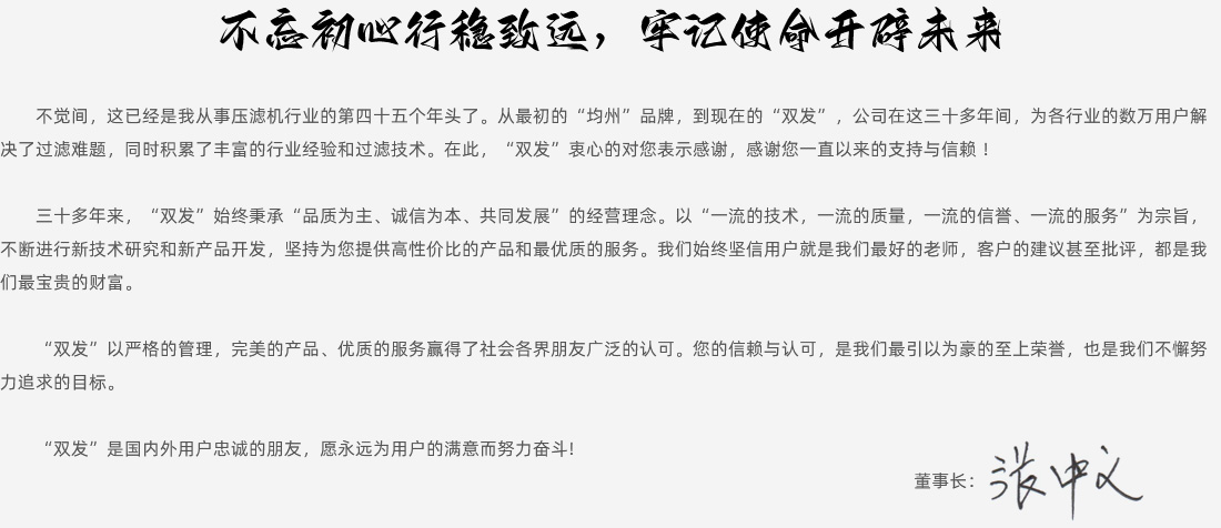 “濾污水為清泉,變污泥為凈土,還廢礦渣為青山綠地”,誠(chéng)信塑品牌,質(zhì)量出名牌。三十多年來,“雙發(fā)”始終秉承“品質(zhì)為主、誠(chéng)信為本、共同發(fā)展”的經(jīng)營(yíng)理念。以“一流的技術(shù),一流的質(zhì)量,一流的信譽(yù)、一流的服務(wù)”為宗旨。不斷進(jìn)行新技術(shù)研究和新產(chǎn)品開發(fā),堅(jiān)持為用戶提供高性價(jià)比的產(chǎn)品和最優(yōu)質(zhì)的服務(wù)。